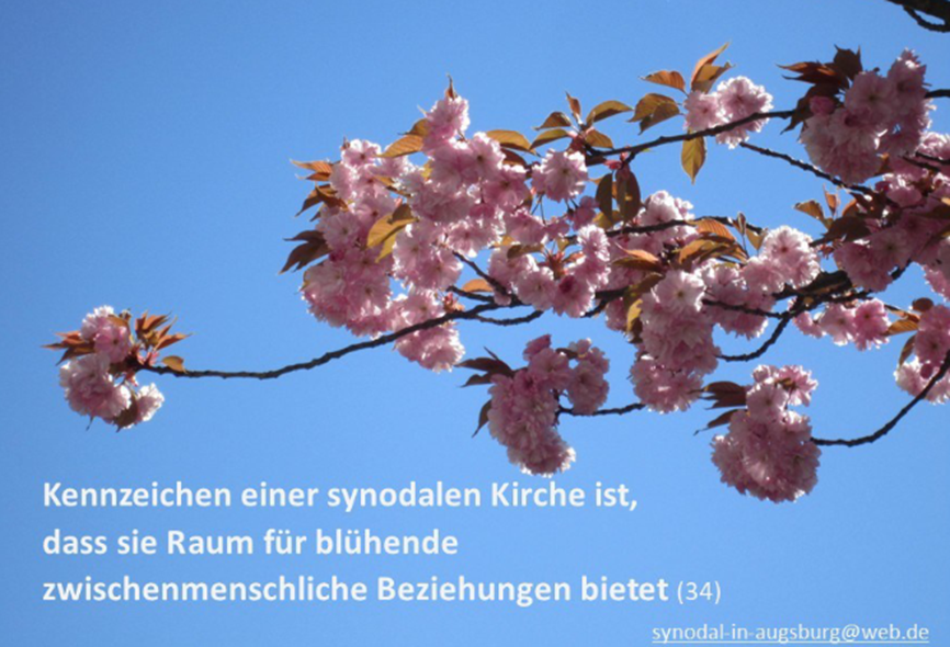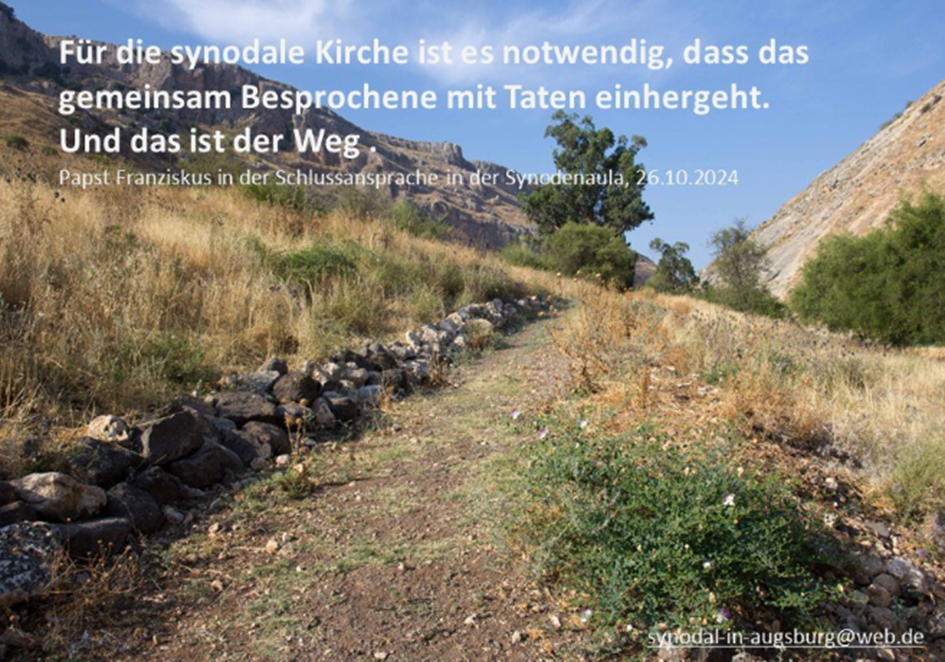 In der Diözese Augsburg gibt es die Gruppe „Synodal-in-Augsburg“. Von dieser berichtet Paul Ulbrich. Diese Gruppe fragte sich, wie man Synodalität in den Gemeinden fördern und stärken könne. Daraus entstand der „Digitale Koffer Synodalität – Wir gestalten Kirche – Praktisches für die Praxis“ (https://padlet.com/eweissenhorn/digitaler-koffer-synodalit-t-wir-gestalten-kirche-praktische-bruuxshroj2sbass). Man hatte weiter die Idee, Bildkarten zu entwerfen und auf diese Sätze aus dem Schlussdokument der Weltsynode (2024) und aus der Schlussansprache des Papstes (Titel: Für eine synodale Kirche, 26.10.2024) aufzudrucken (https://padlet.com/eweissenhorn/digitaler-koffer-synodalit-t-wir-gestalten-kirche-praktische-bruuxshroj2sbass/wish/E1P8aX7Kz1vEWwA9).